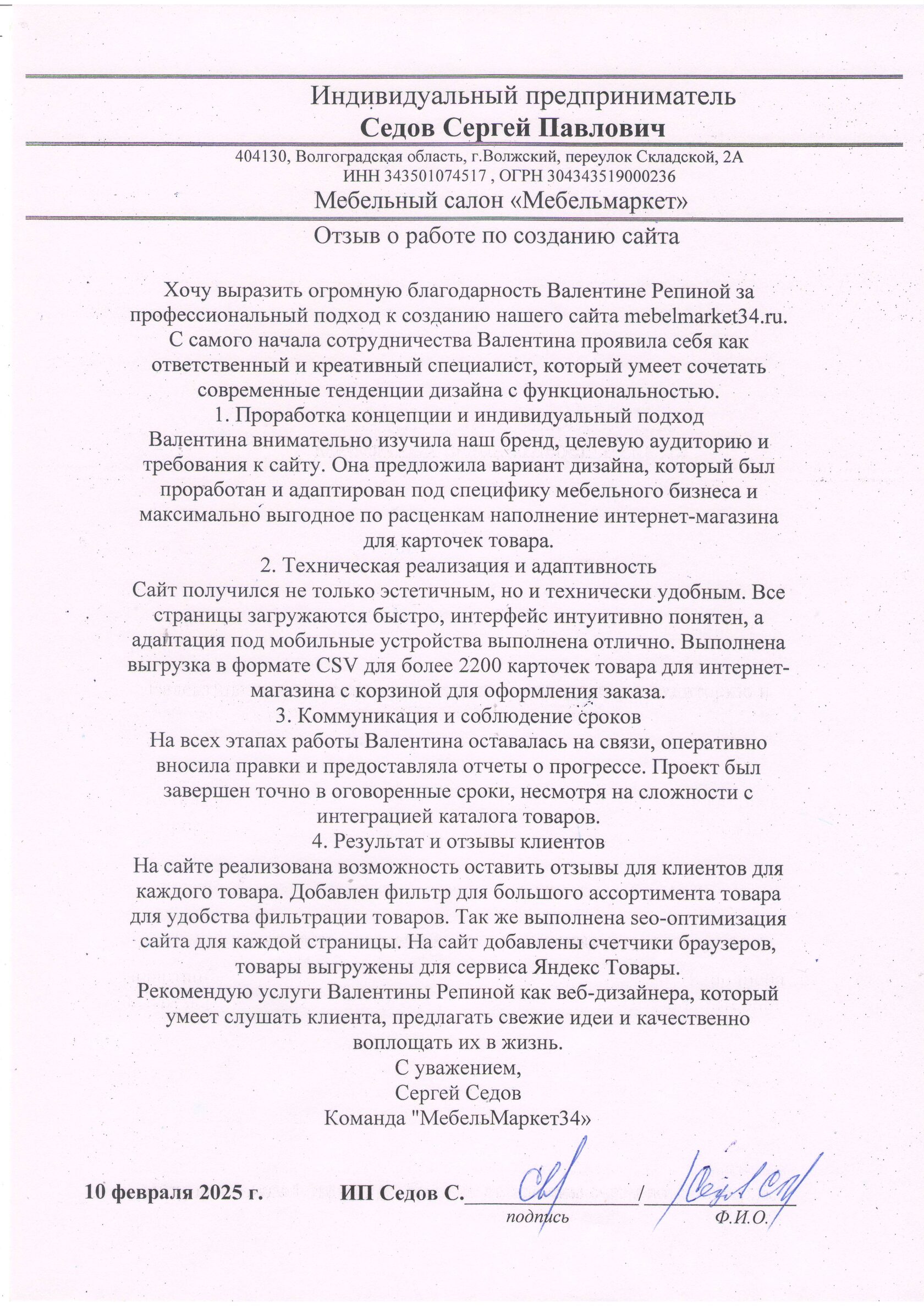 Отзыв по созданию сайта онлайн-магазина МЕБЕЛЬМАРКЕТ